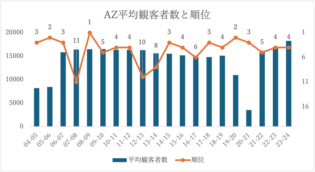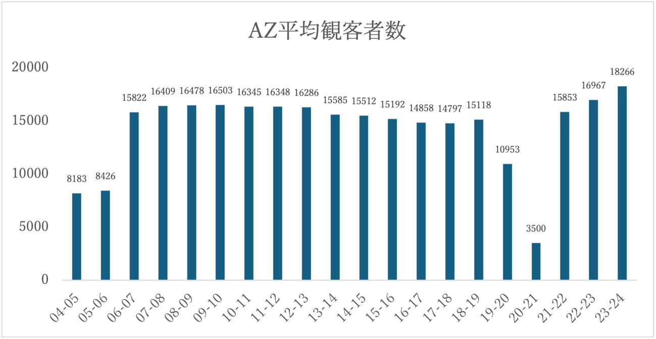 その結果、2023-24シーズンには過去最高となる平均観客動員数18,226人を記録しています。これらの事実から、AZにおいては新スタジアム建設および改修工事が観客動員数の増加に大きく寄与していると結論づけられます。