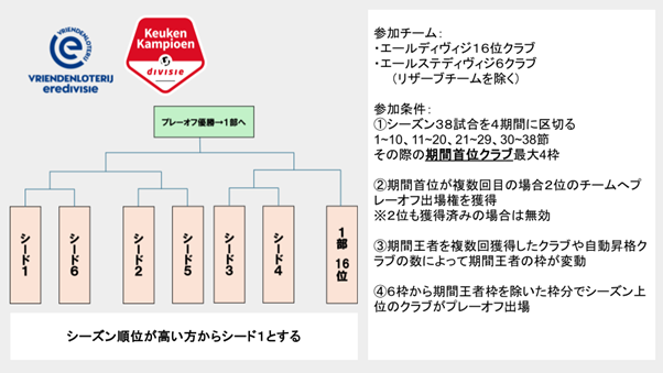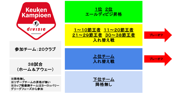 オランダ2部リーグであるエールステディヴィジはエールディヴィジより2チーム多い20チームで構成されています。1位2位のクラブは自動昇格し、その他の上位6クラブとエールディビジで16位だったクラブが入れ替え戦を行うためシーズン終盤まで多くのクラブに昇格のチャンスが残されていること、降格が事実上存在しないことが大きな特徴です。
