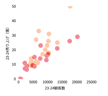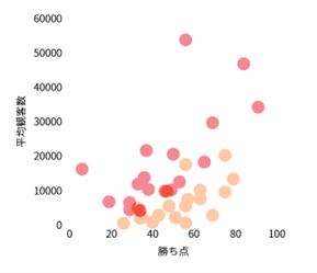 過去20年間の内、特筆して観客数を伸ばしたゴーアヘッドイーグルス、PECズウォレを例に見てみます。両クラブは20年前に比べ7割以上、観客数が増加しています(図6)。その要因として考えられるのが昇格、スタジアム、成績の3点です。20年間の昇格チームの観客数を調べたところデータが無かった2004年を除き、必ず昇格年に観客数が増加していました。平均6割の増加は、クラブのチケット収入を飛躍的に増加させることを意味します。このことから、昇格は集客面だけでなく、クラブの財務基盤を一気に強化する最大の機会であると分析できます。PECズウォレの観客数の伸びが特に激しかった2010年は新スタジアムが完成した年でもありました。その年の観客数を維持したまま2012/2013シーズンに昇格を果たし、現在は1部常連クラブへと成長しています。同様の事象はAZアルクマールにも見られ、スタジアムが新設された2006/2007シーズンに前年に比べ約2倍に増加しています。図7は2023/2024シーズンのデータを用いており、赤い点がエールディヴィジクラブを、オレンジの点がエールステディヴィジクラブを示しています。好成績という点に関しては同図からわかるように勝ち点を積めば観客も増えるという傾向があります。これはオランダに限らず日本でも言えることでしょう。