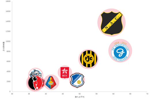 前述の2.1節で昇格が観客数の増加に繋がる可能性について論じました。しかしながら、エールステディヴィジに所属するクラブの中には、財政規模や競技力の観点から昇格を主要目標としていないクラブ、あるいは昇格が困難なクラブが存在します。さらに、たとえ昇格したとしても欧州五大リーグに次ぐ水準にあるエールディヴィジへ昇格した後、その地位を維持することは、極めて困難な課題となります。