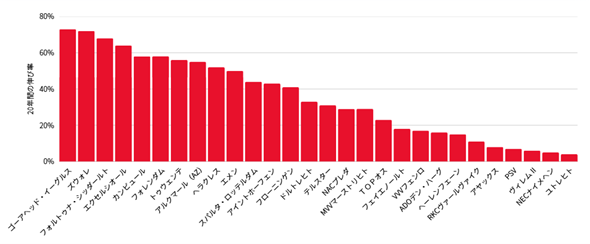 記事を書くにあたって20年間の1部、2部のデータから観客数の伸び率を算出しました(20年間でクラブライセンスを失ったクラブ、データが無いクラブ、ユースチーム、観客数が減少したクラブ除く)。この伸び率を糸口にクラブがどのように成長し、観客を増加させたのかを探ります。
